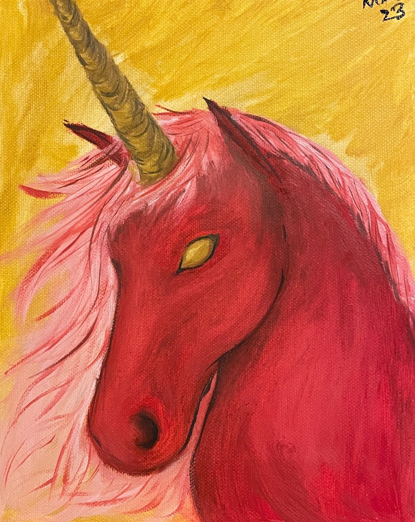 First time messing with oil paints. Usually paint in a small room so maybe not smart? 😅 I usually prefer acrylics, but a friend bought me some oils in a set as a gift. Also she likes unicorns and the color red.