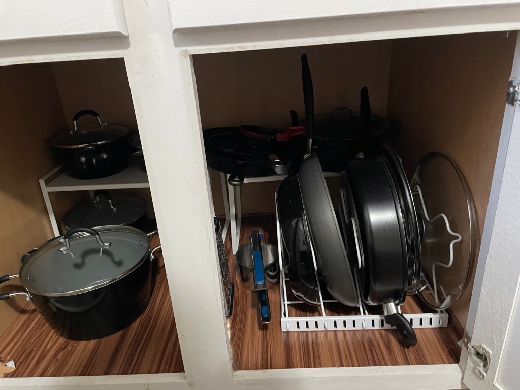 The little wire pan organizer was really easy to put together, and did a great job. It fits the larger pans fine – I might get a second one to organize the smaller pans as well.