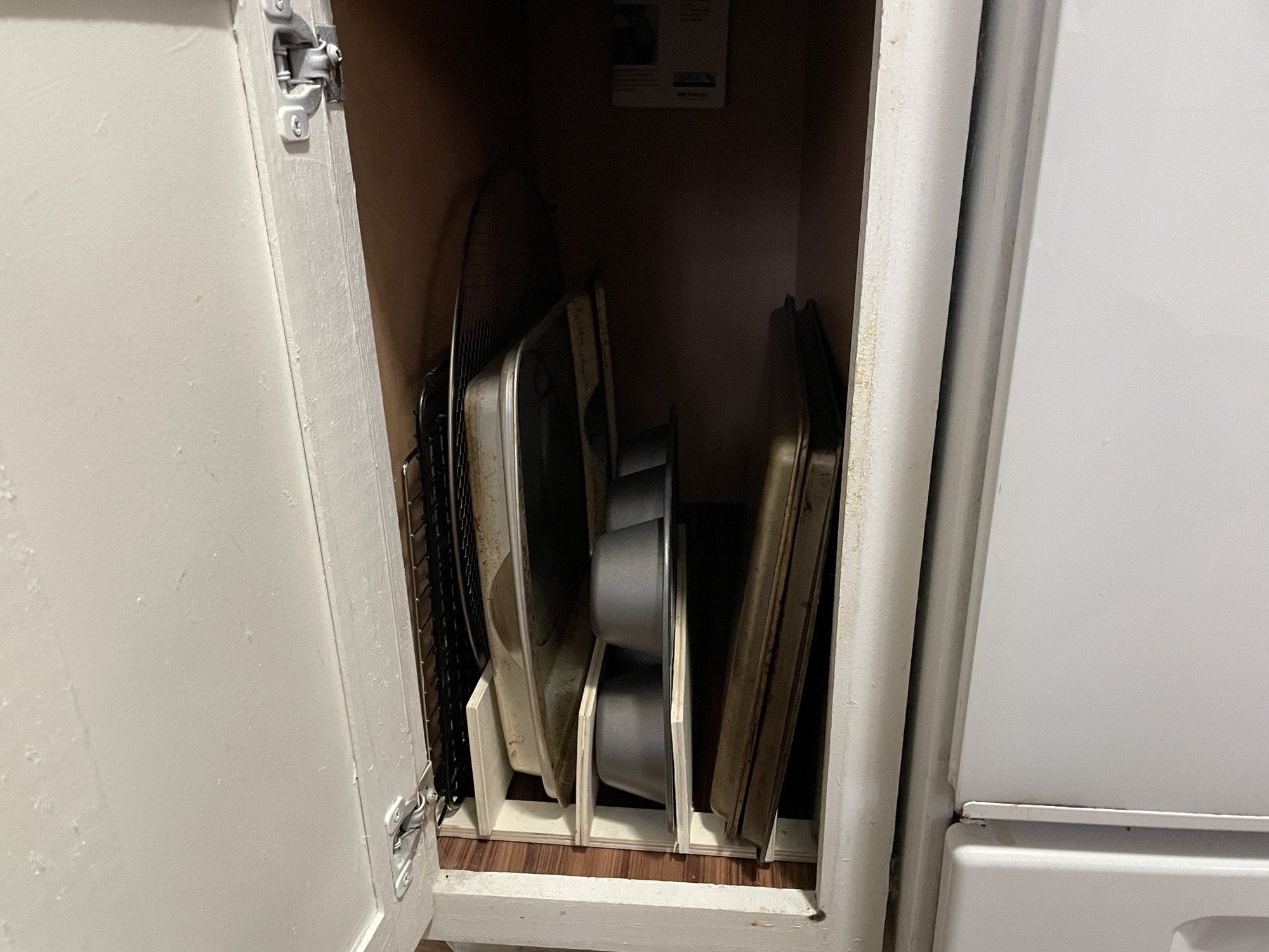 The little wood panels also worked great as a concept. Some things I will consider when I make a nicer one eventually: better wood is a must, and perhaps glue the panels down first before securing tightly with nails to ensure more evenness. It’ll do the job for now though. I also have the other side with baking dishes that are all glass (casserole, pie, bread dishes) and the accursed plastic container hell that needs to be organized, but those might need more creativity.