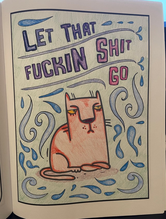 The deep mindful breaths were easily done. Coloring for 10 minutes extended into coloring while listening to music for much longer. I have two coloring books that I have received as birthday gifts, and one of them is the Swearing Cats Coloring Book. I flipped through it to find a page I wanted to color and came across this one with one of my favorite sayings: