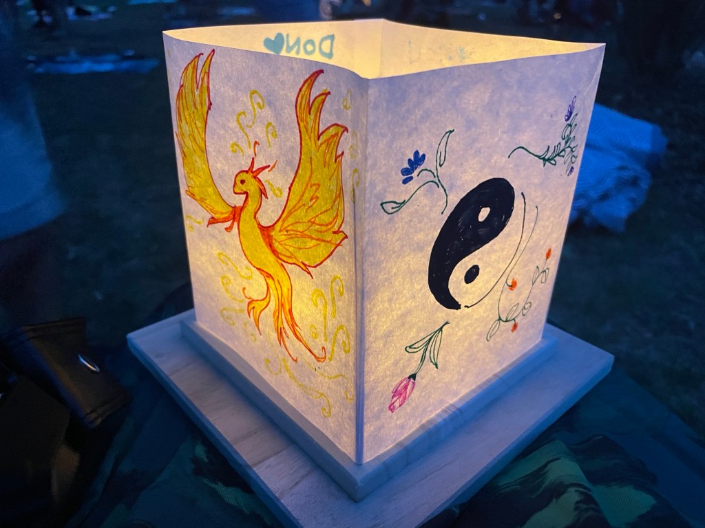 Setting my clothes out is a bit hard, because the cats will lay down on them, but I did plan an outfit for a day out. On Saturday, I went to OKC for the Water Lantern Festival they have every year – it was rescheduled from April because of weather. We’re starting to get into the really hot time of year for our area, but there was a nice breeze and plenty of shade in the park where they hold the festival. I chose to wear a green dress I had bought earlier in the year just for the occasion. At first the breeze swept most of the lanterns to one side of the pond, but after awhile they shifted and spread out more.