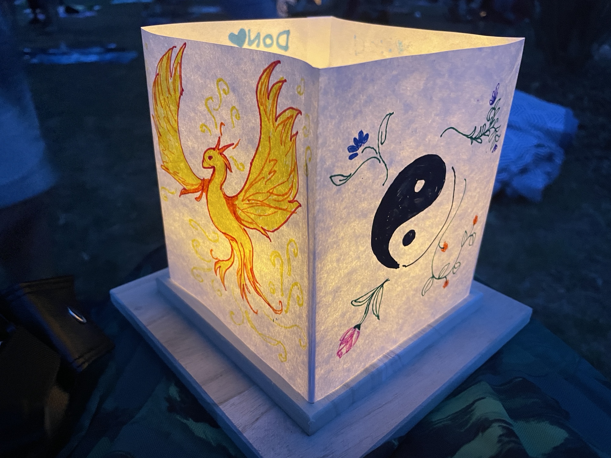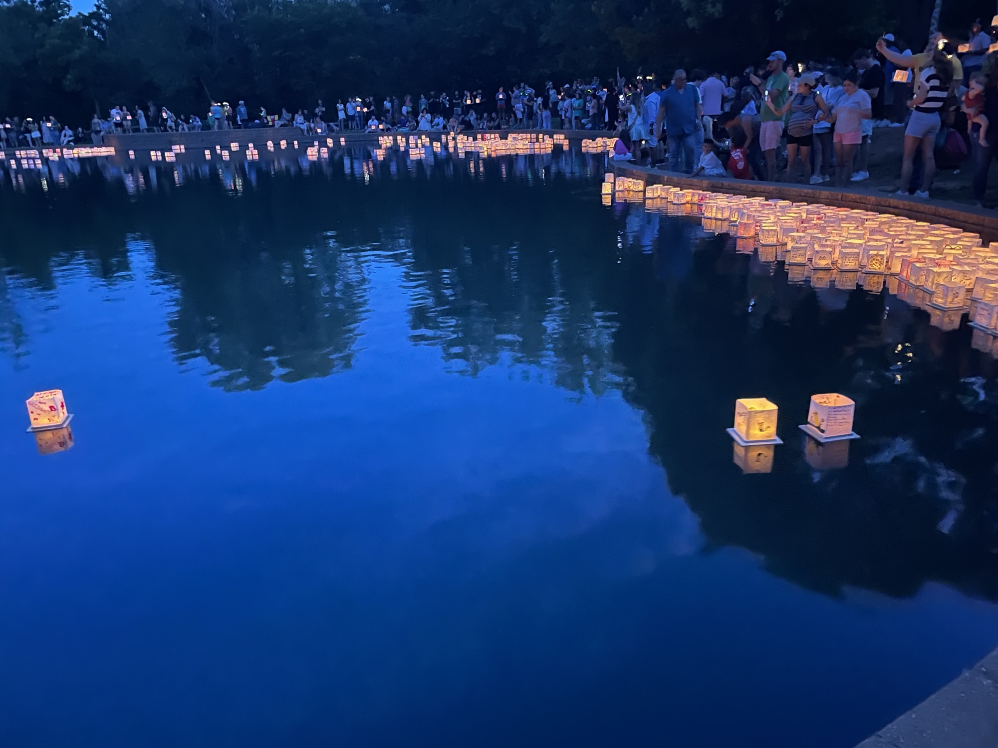 Setting my clothes out is a bit hard, because the cats will lay down on them, but I did plan an outfit for a day out. On Saturday, I went to OKC for the Water Lantern Festival they have every year – it was rescheduled from April because of weather. We’re starting to get into the really hot time of year for our area, but there was a nice breeze and plenty of shade in the park where they hold the festival. I chose to wear a green dress I had bought earlier in the year just for the occasion. At first the breeze swept most of the lanterns to one side of the pond, but after awhile they shifted and spread out more.