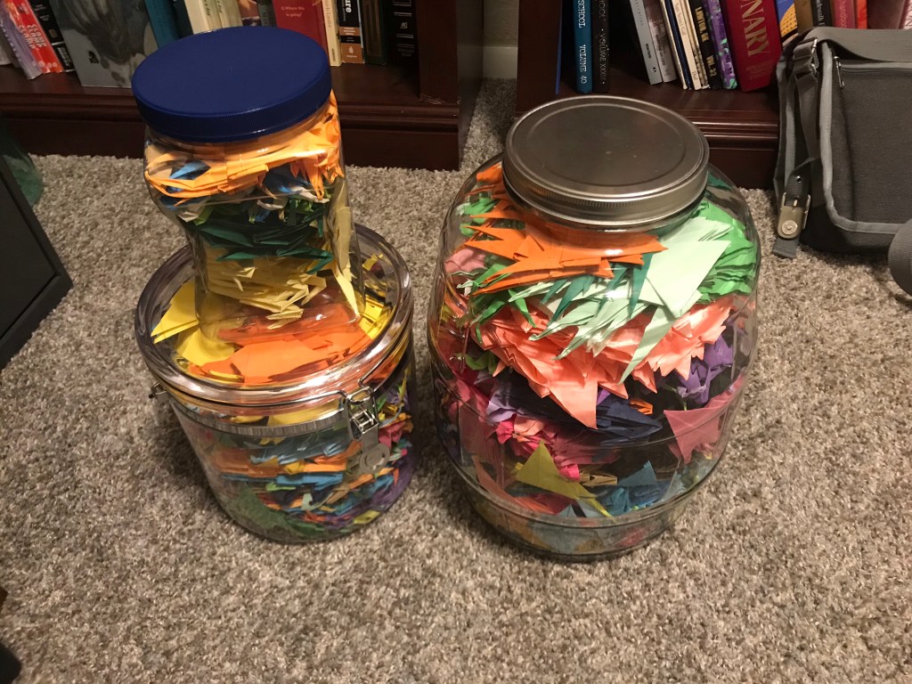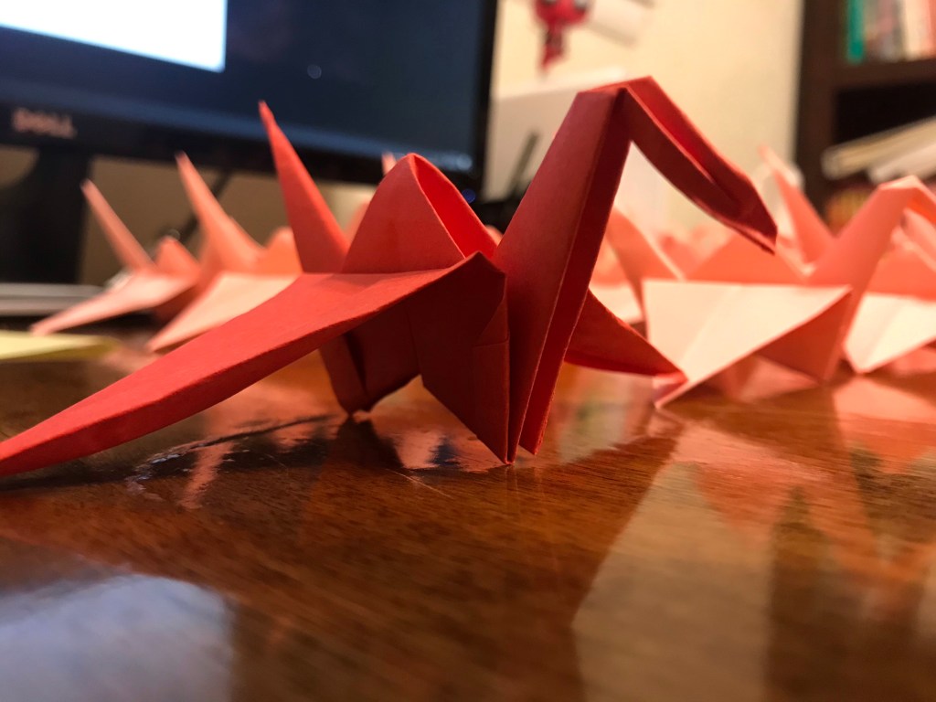 1000? On April 26, 2020 By MaryIn CranesLeave a comment By my count, this should be 1000 cranes, but…. …the box says it was only 1000 sheets. And I still had 5 left.….. Just to be safe, I’ve folded them too. I will do an official count at another time. For now, I’m done with my 1000 cranes.