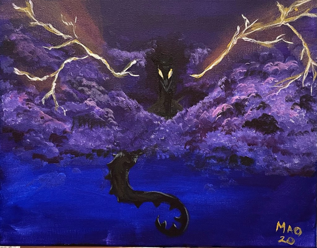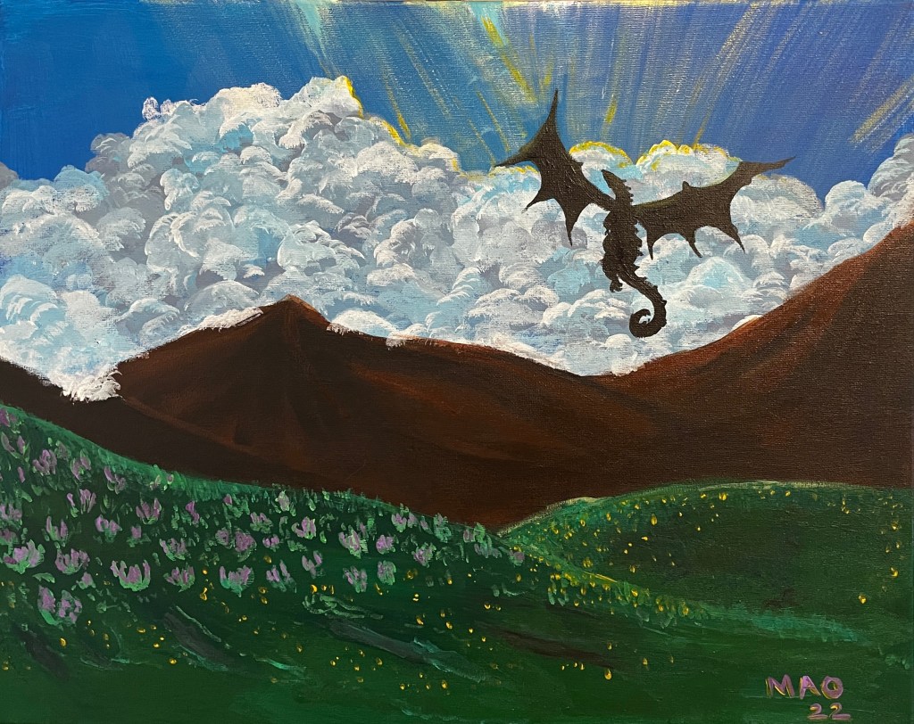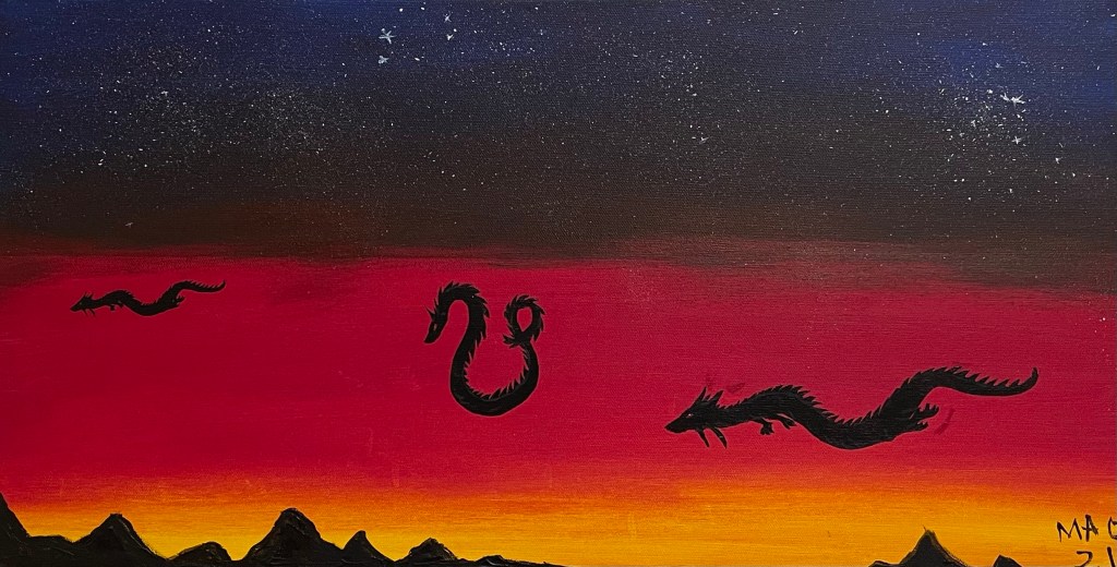 Finally did the large version of this. Not entirely satisfied with how the sky came out, but I like the dragons. I originally drew them digitally and then cut a stencil with a Cricut, which is why the small one in the back looks exactly the same as the closer/larger one.