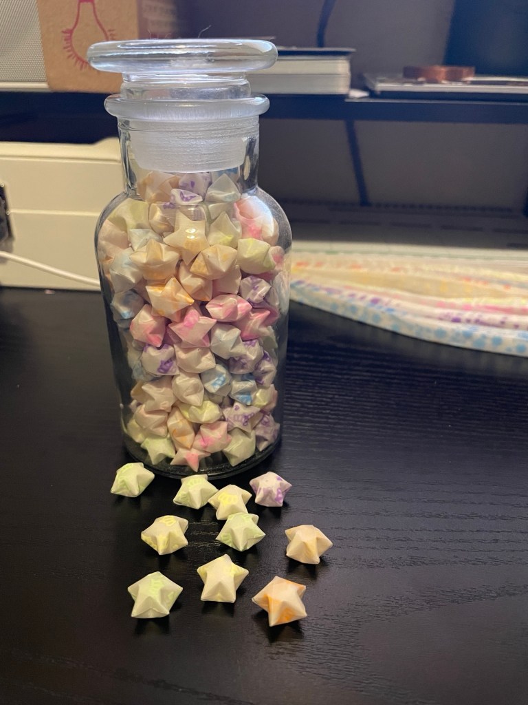 So I did initially start with hearts, but the strips I have are too thin and long to make nice looking ones, so I opted to cheat and re-learn the stars. Once I followed the directions the first time it came back really easily. I decided to go ahead and make 100 and put them in a jar, for one small wish. But I didn’t really keep count and made 210.
