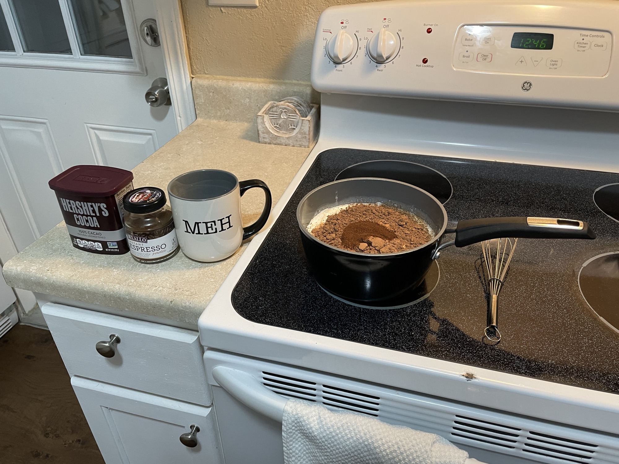 For cocoa, I’m a little loose on measurements and you can really probably proportion the ingredients however you want. Typically I use the cup I’m going to drink from to measure my cream and then add a tablespoon of cocoa and a tablespoon of sugar, but I wanted two cups so I used up my entire container of cream, and went ahead and did 3 tablespoons of cocoa, 3 tablespoons of sugar, and a tablespoon of instant espresso because why not? Put over medium to medium low heat and wisk constantly. Constantly!