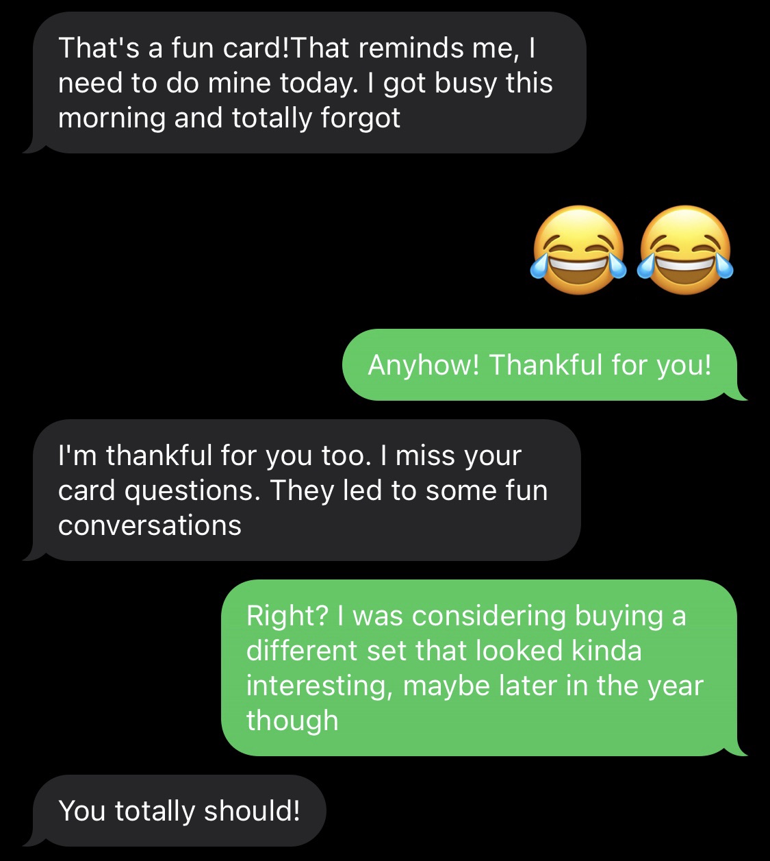 I told a few friends that I was thankful for them, but mostly because I’m awful at being nice, I took a picture of the card and texted it to them. One of them just hearted the message, and the other resulted in this brief conversation: